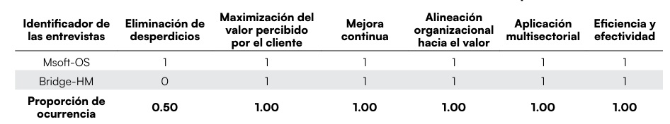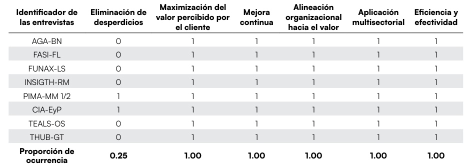 | Identificador de las entrevistas | Eliminación de desperdicios | Maximización del valor percibido por el cliente | Mejora continua | Alineación organizacional hacia el valor | Aplicación multisectorial | Eficiencia y efectividad |