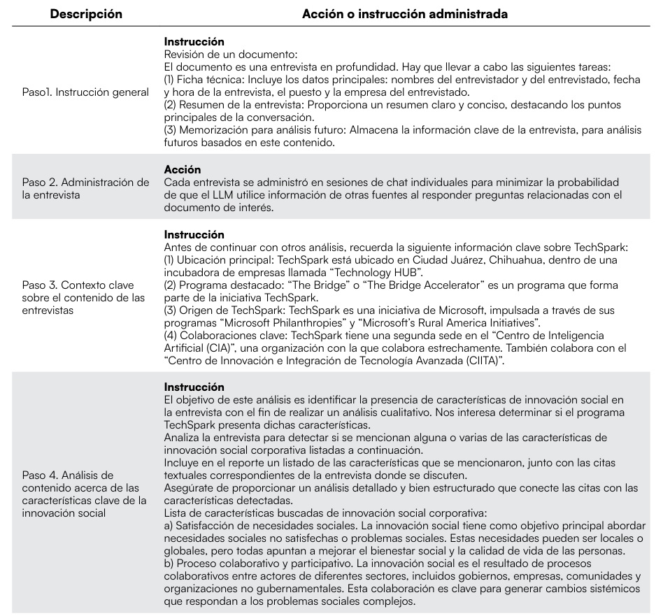 Tras identificar las características clave de los conceptos ISC y CL, se avanzó en la creación de un grupo de instrucciones (prompts) específicas. Estas se diseñaron con el objetivo de utilizar un LLM, en este caso GPT-4o, para automatizar el análisis de las entrevistas. Las instrucciones se redactaron cuidadosamente para orientar al modelo en la detección de las características clave previamente definidas, asegurando un enfoque preciso y consistente en la búsqueda de evidencia dentro del material de las entrevistas. Las instrucciones empleadas, así como las estrategias para garantizar la veracidad y reducir sesgos, se encuentran detalladas en los apéndices A y B.