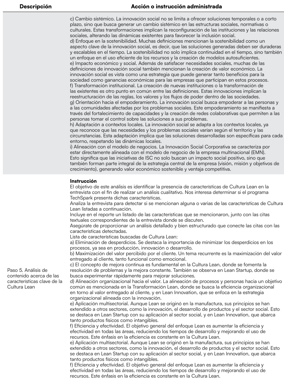 para entender la particularidad del caso, este estudio propone una segunda etapa de análisis diseñada específicamente para el proyecto TechSpark, en la cual se empleó el modelo de lenguaje ChatGPT-4o. Esto permitió volver a revisar a fondo 11 entrevistas no estructuradas realizadas exclusivamente a miembros del eje The Bridge Accelerator y a los representantes del proyecto TechSpark en Juárez-El Paso. Este análisis iterativo con el desarrollo de prompts únicos y precisos de acuerdo con las particularidades del caso, permitió evaluar con mayor detalle las intervenciones de la organización para fortalecer el ecosistema de negocios binacional, su capacidad para abordar las barreras estructurales, su alineación con el modelo de negocio empresarial, y su impacto en el desarrollo económico sostenible del Borderplex. Los resultados comparados entre el primer y el segundo análisis arrojaron que estamos frente a un modelo de ISC diferente al registrado por la literatura más tradicional, ya que incorpora de forma sistemática los principios de la producción esbelta. En este tenor proponemos que nos encontramos frente a un modelo emergente de Innovación Social Corporativa Esbelta (ISCE). Este concepto describe un marco teórico que combina características de Innovación Social Corporativa (ISC) y Cultura Lean (CL), sin pretender establecer una metodología operativa específica, sino un enfoque para analizar iniciativas empresariales con impacto social y eficiencia operativa. De acuerdo con Wirotthitiyawong et al. (2025), la integración de teorías de emprendimiento social e innovación proporciona un marco comprehensivo para economías en desarrollo, extendiendo la teoría de capacidades dinámicas al demostrar cómo las capacidades de innovación transforman competencias en resultados sostenibles, lo que refuerza la relevancia de ISCE para iniciativas como TechSpark en contextos como el de Ciudad Juárez.