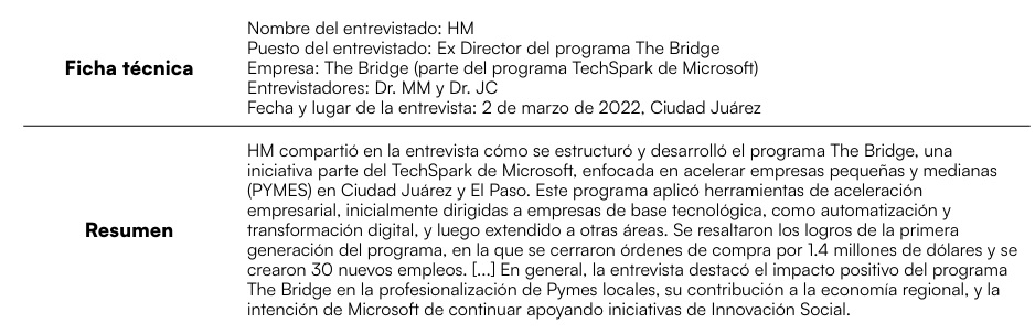 Desde su lanzamiento en 2019 en Ciudad Juárez, The Bridge Accelerator, ha extendido su impacto a emprendedores de Juárez, otras ciudades de Chihuahua y El Paso. Financiado inicialmente por TechSpark para un programa piloto, sus notables resultados llevaron al presidente de Microsoft a invertir 1.5 millones de dólares, garantizando su continuidad por seis generaciones adicionales (El Economista, 2019). Para su quinta edición, había capacitado a 52 PyMEs, creado cerca de 300 empleos y atraído un millón de dólares en inversión, potenciando habilidades digitales mediante el programa TEALS (Tecnología Educativa y Apoyo al Aprendizaje, por sus siglas en inglés) y fortaleciendo el ecosistema tecnológico regional (Matus-Ruiz et al., 2023).