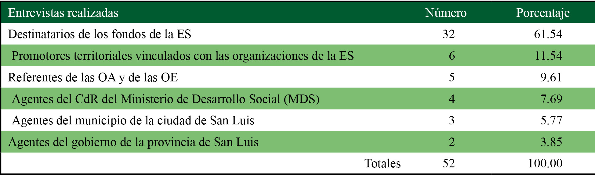 En la tabla 1 se observa la población determinada, donde, de un total de 52 entrevistas, el 61.54% correspondió a los destinatarios de los fondos de la ES que dependen de las OA que tienen sus domicilios en la ciudad de San Luis. La diferencia manifiesta se debe a que el grupo de los destinatarios de los fondos es mayor que los otros identificados.