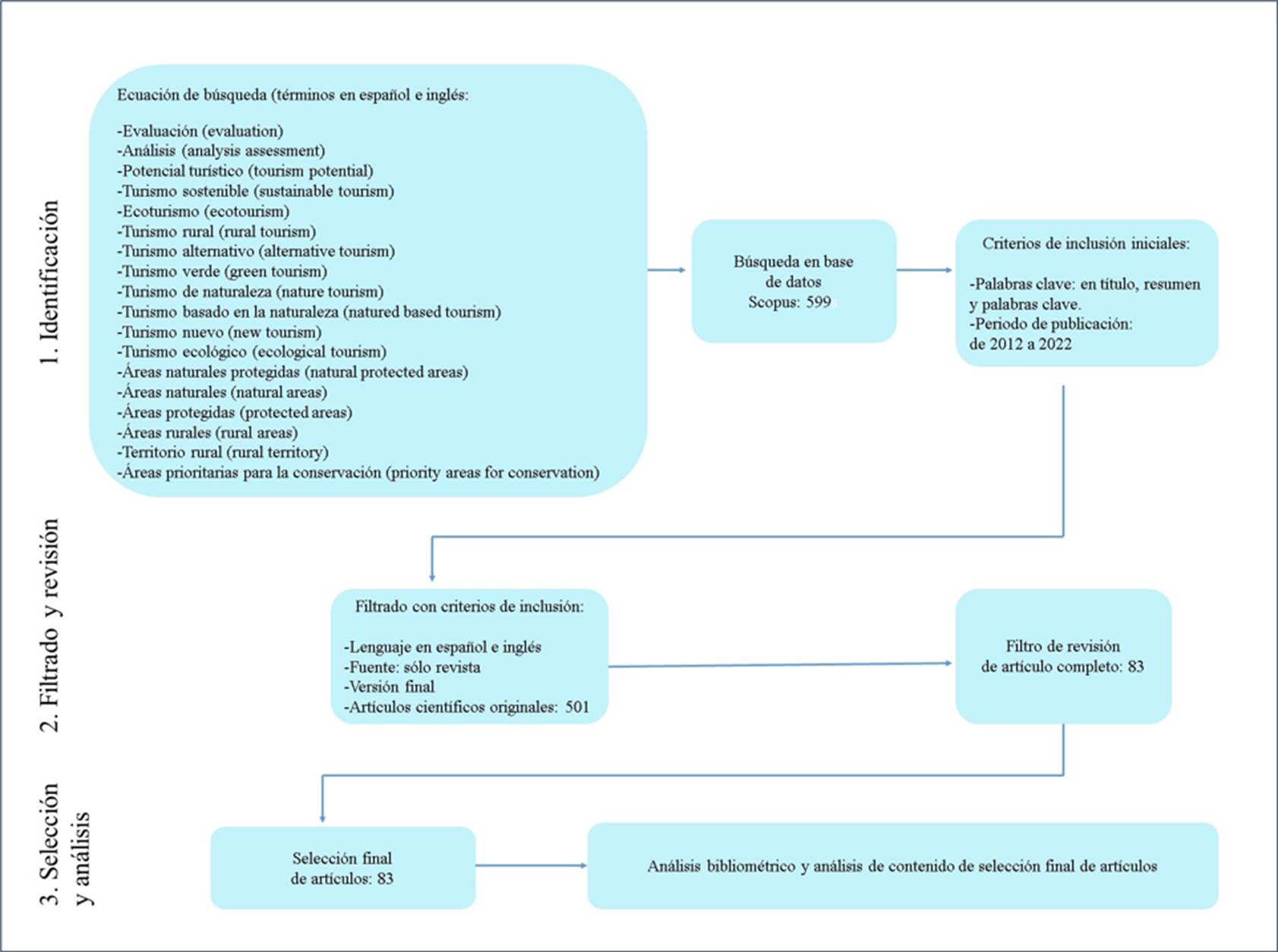 El análisis bibliométrico implicó una revisión sistemática cuantitativa de la literatura (SQLR) (Pickering y Byrne, 2014), la cual constó de tres fases: 1) identificar los elementos de búsqueda; 2) filtrar la bibliografía arrojada en la búsqueda a través de criterios de inclusión previamente establecidos, y 3) seleccionar los estudios a analizar a profundidad. La primera etapa incluyó formular una ecuación de búsqueda usando palabras clave y sinónimos tanto en español como en inglés, siendo los siguientes: valoración, potencial turístico, turismo sostenible y territorio rural. Después se realizó la búsqueda en la base de datos Scopus https://www.scopus.com/, al ser una de las bases de datos multidisciplinaria más amplia a nivel internacional, que alberga publicaciones científicas de alta calidad y ha sido empleada por otros autores en análisis bibliométricos relacionados con el turismo (Garrigos, Narangajavana y Lengua, 2018, ( Niñerola, Sánchez y Hernández, 2019), (Rosalina, Dupre y Wang, 2021), y (Xu, Ao, Liu y Cai, 2022). Los criterios iniciales de inclusión fueron: 1) que los términos de búsqueda aparecieran en el título, resumen o palabras clave y 2) que el año de publicación estuviera dentro del rango 2012-2022. Después de aplicar estos criterios de inclusión, se obtuvo un total de 599 artículos.