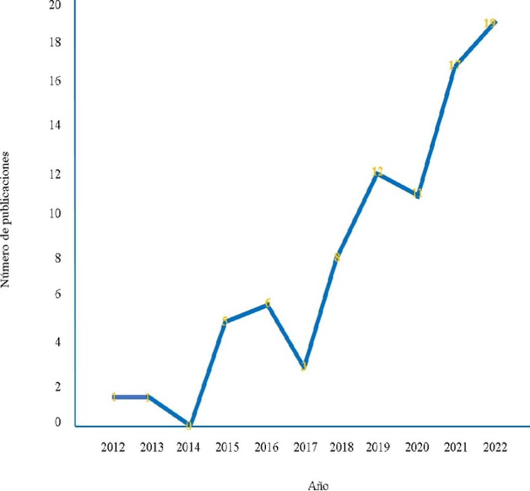 Se identificó un crecimiento anual no constante, es decir, no ajustado a un modelo lineal o exponencial, en la producción de artículos sobre valoración del potencial turístico en el periodo del año 2012 al 2022, con una tasa de crecimiento anual del 34% y el año 2022 fue el de mayor producción (17 publicaciones), lo cual se indica en la Figura 2. Esto concuerda con lo descrito en otros estudios bibliométricos sobre turismo rural (Rosalina et al., 2021); turismo sostenible (Garrigos et al., 2018); (Niñerola et al., 2019), y ecoturismo (Xu et al., 2022), los cuales reportan un incremento gradual en la producción científica a partir del año 2010, posiblemente por el impulso al desarrollo sostenible por parte de los distintos gobiernos del mundo en las últimas dos décadas para afrontar la crisis ambiental (Cardoso, 2006).