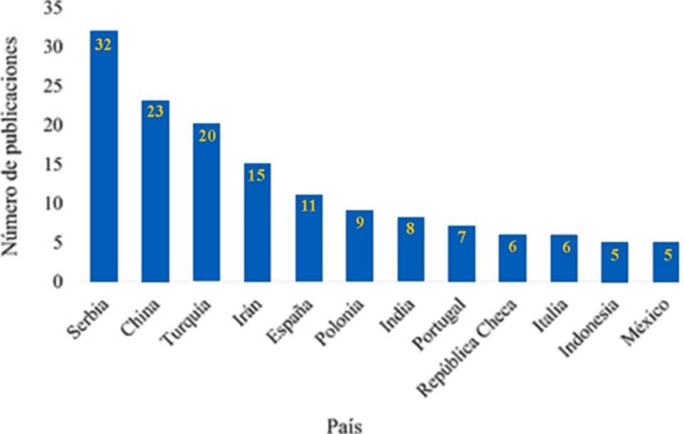 En cuanto al origen de las publicaciones, se identificaron 36 países distintos, de los cuales Serbia, China y Turquía sobresalieron como los de mayor producción científica (Figura 3). Esto contrasta con el liderazgo mundial en oferta ecoturística y rural por parte de Latinoamérica (Stronza y Durham, 2008), donde sólo figuró México en el puesto número diez de producción científica. Adicionalmente, cabe señalar que en otros trabajos de revisión sobre turismo sostenible (Garrigos et al., 2018), (Niñerola et al., 2019) y (Xu et al., 2022), Estados Unidos de América sobresalió como país líder en producción científica.