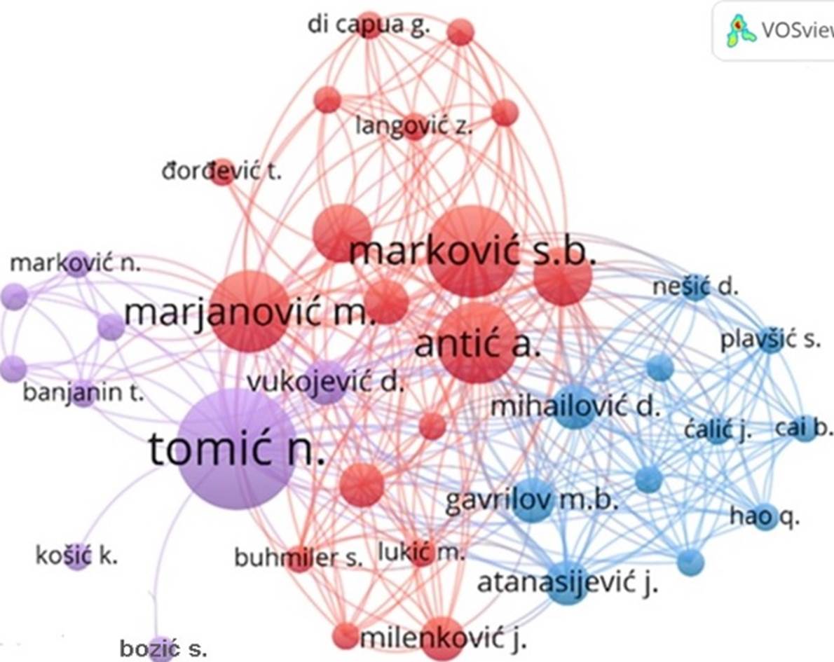 El análisis bibliométrico identificó 269 autores, de los cuales sólo diez de ellos no colaboraron con ningún otro autor a través de algún artículo. El grupo de trabajo más grande estuvo formado por 18 autores, la mayoría pertenecientes a alguna institución ubicada en Serbia (Figura 4), lo que coincide con que este país tenga la mayor producción científica en el mundo sobre el tema. Dentro de este grupo, Tomić (nueve publicaciones), Marković (seis publicaciones) y Antić (seis publicaciones) se identificaron como los autores de mayor producción científica, específicamente sobre temas relacionados a valoración del potencial del geoturismo y del patrimonio paleontológico (Figura 4). Por otro lado, los autores con mayor número de citas fueron Cetin (343 citas), Sevik (247) y Cakir (160), pertenecientes al mismo grupo de trabajo en Turquía y autores de algunos de los artículos de mayor citación relacionados con valoración del potencial turístico de áreas naturales protegidas.