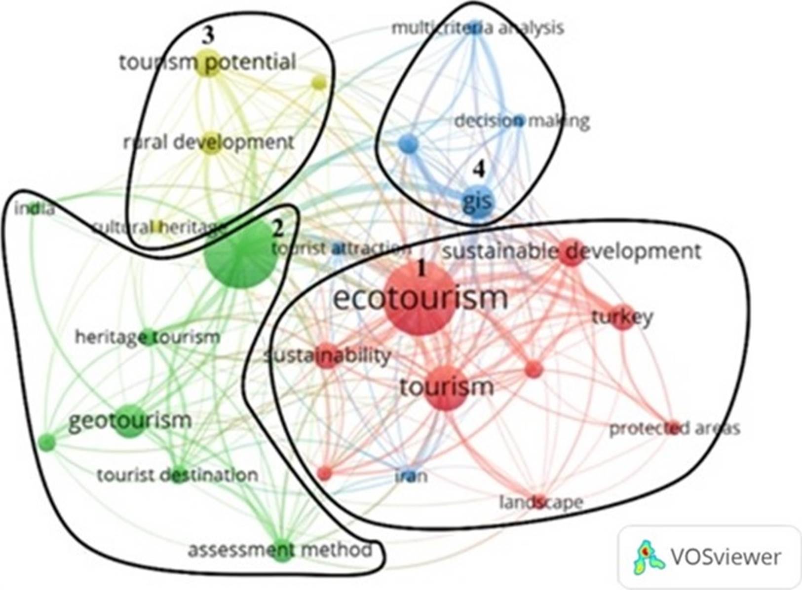De 656 palabras clave seleccionadas por contar con una frecuencia mínima de aparición en cinco artículos, la más frecuente fue “ecoturismo”, la cual se repitió en 28 publicaciones en el apartado de palabras clave. En total, se identificaron cuatro grupos de palabras clave (Figura 5):