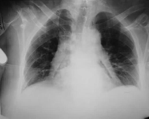 Figura 1 Radiografía de tórax que muestra ensanchamiento mediastinal y una banda radiotransparente que envuelve al pericardio.