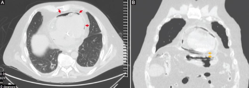 Figura 2 Tomografía computarizada toracoabdominal simple en ventana pulmonar. A: corte axial que muestra neumopericardio (flechas). B: corte coronal en el que se observa el trayecto fistuloso que comunica la cámara gástrica con el pericardio (flechas).