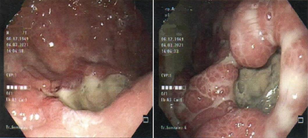 El paciente ingresó a la unidad de cuidados intensivos y el drenaje mediastinal continuó con salida de líquido turbio. La evolución fue tórpida, con datos de disfunción orgánica múltiple secundaria a sepsis, y falleció 72 h posteriores al evento quirúrgico. Los resultados del cultivo revelaron Candida albicans y el resultado de la biopsia fue de úlcera gástrica benigna.