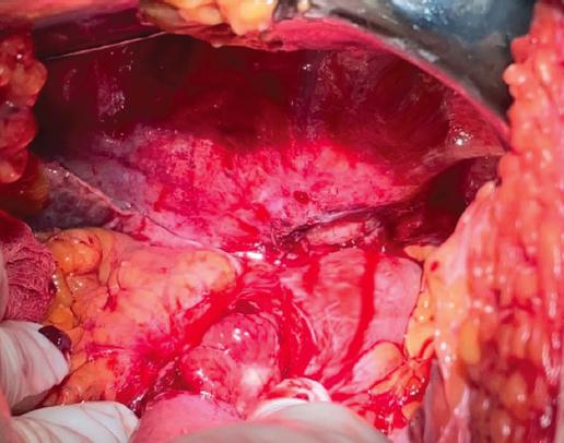 Se realizó laparotomía exploradora de urgencia, con incisión supra- y medioumbilical, y se localizó el estómago en su porción de curvatura menor con tejido fibrótico adherido al diafragma correspondiente a un trayecto fistuloso por úlcera gástrica penetrada hacia el pericardio, obteniendo un defecto gástrico de aproximadamente 3 × 2 cm (Fig. 4). Se realizó resección del borde de la úlcera gástrica, manejado con cierre en dos planos más colocación de parche de Graham. Posteriormente se realizó plastia diafragmática con cierre primario usando Vicryl 1-0. En un segundo tiempo quirúrgico se amplió la incisión a nivel esternal para resección del apéndice xifoides y disección de grasa pericárdica anterior para realizar una pericardiotomía de 3 × 3 cm. Se encontró exudado purulento, del cual se tomó muestra para cultivo. Se realizó lavado con solución salina y posteriormente, bajo visión directa, se colocó un drenaje de 36 Fr en la cavidad pericárdica y drenajes endopleurales bilaterales de 36 Fr. Se colocaron Penrose a nivel del fondo gástrico y sonda nasogástrica para descompresión posoperatoria. Se cerró la pared abdominal y se fijaron sellos endopleurales.