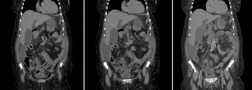 Al inicio de su padecimiento, 2 semanas previas a su ingreso, se presentó con dolor pélvico bilateral y fiebre que no cedió con el uso de analgésicos y antipiréticos, diarrea y vómito, sin síntomas urinarios. Fue llevada a atención hospitalaria en otro centro, el US reveló litiasis vesicular y la TC simple mostró litiasis bilateral, con deterioro de la función renal. Se egresó de manera voluntaria después de 1 semana y fue trasladada a nuestro centro médico, donde ingresó con datos de urgencia dialítica. Tras la colocación de un catéter para hemodiálisis presentó deterioro de la función respiratoria, requiriendo manejo avanzando de la vía aérea. En su hospitalización se diagnosticó con choque séptico de probable foco urinario, necesitando apoyo aminérgico. Se interconsultó a cirugía general, encontrando en la exploración física plastrón en la fosa iliaca derecha y gasto fecal por sonda de Foley.