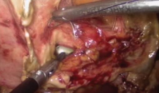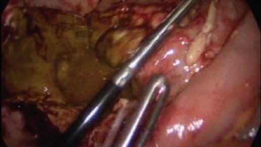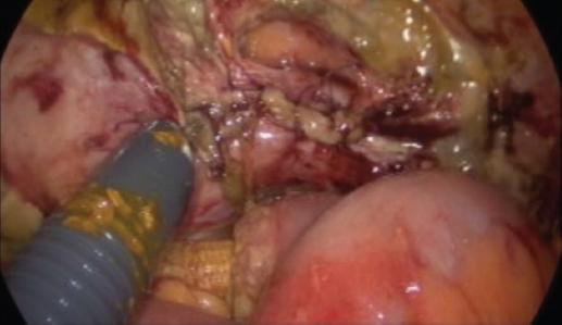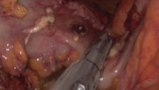 Se decidió realizar exploración quirúrgica de urgencia por abordaje laparoscópico, encontrando material intestinal y purulento libre en la cavidad (Fig. 2), con el ciego perforado hacia la vejiga, observándose el globo de la sonda transuretral (Fig. 3). Se realizó hemicolectomía derecha (Fig. 4) con ileostomía terminal, cierre primario de la perforación vesical en tres planos (Figs. 5 y 6) y colocación de drenaje. La paciente se mantuvo en vigilancia posoperatoria en terapia intensiva, resolvió el cuadro de sepsis abdominal y fue egresada al sexto día a piso para continuar su recuperación a cargo de los servicios de nefrología y cirugía general. En el día 15 de posoperatorio se evidenció una nueva colección intraabdominal en la corredera parietocólica derecha, la cual se trató mediante drenaje percutáneo y antibiótico por vía intravenosa, resolviéndose sin complicaciones. Continuó con evolución tórpida por sus patologías de base, requiriendo múltiples sesiones de hemodiálisis, y finalmente falleció por complicaciones asociadas a la enfermedad renal.