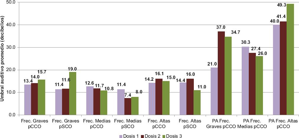 En los pacientes sin ototoxicidad no hubo diferencia intragrupo en los umbrales de las frecuencias graves (p = 0.99), medias (p = 0.141) ni agudas (p = 0.180) entre los estudios de aquellos que recibieron dos dosis (p > 0.05); no fue procedente el análisis en el único paciente con tres dosis.