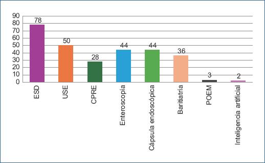 El 93.8% respondió el deseo de desarrollar mayores habilidades endoscópicas y procedimientos más complejos de los que realizan actualmente, como disección endoscópica de la submucosa (DES) (68.1%), USE (45.1%), cápsula endoscópica y enteroscopia (37.2%), endoscopia bariátrica (29.2%) y colangiopancreatografía retrógrada endoscópica (CPRE) (23.9%). Un número reducido de las endoscopistas (0.9%) desearía realizar miotomía esofágica peroral (POEM) y una de ellas respondió que no desearía realizar ninguna técnica avanzada (Fig. 1).