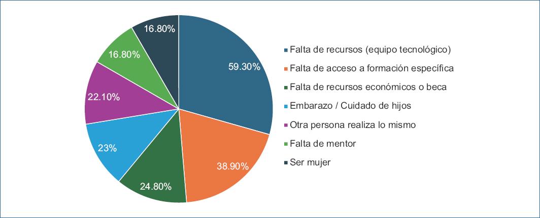 En la figura 3 se muestran las dificultades que han tenido para su desarrollo: la falta de recursos de equipo tecnológico (59.3%) y la falta de acceso a la formación de una técnica específica (38.9%). El 16.8% reportó que su género fue una barrera para avanzar más en su formación.