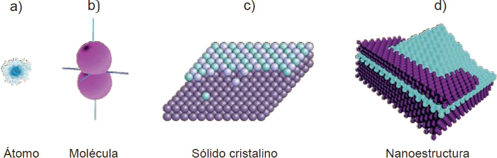 Figura 1 a) Nube electrónica envolviendo un átomo aislado; b) dos (o más) átomos se combinan para formar una molécula mediante una redistribución de sus orbitales; c) arreglo periódico de moléculas forman un sólido cristalino; d) nanoestructura compuesta por una isla piramidal entre varias capas de redes cristalinas distintas, estas pirámides se “auto-ensamblan” en procesos controlados de crecimiento en superficies. (Figura realizada por Patrick Briddon, School of Electrical, Electronic & Computer Engineering).