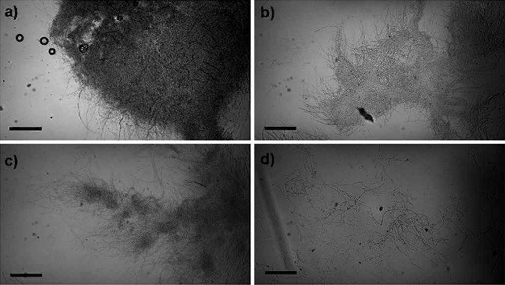 Figura 3 Fotografías de microscopía óptica del efecto del tratamiento sobre el micelio de A. niger (aumento 10×): a) fragmento de colonia crecida en cultivo sumergido en medio mínimo líquido; b) colonia incubada durante 24 h en NaOH 1 M; c) colonia incubada durante 48 h en NaOH 1 M, y, d) fragmentos de micelio observados después del tratamiento con ondas de choque, solvente NaOH 1M. Barra de escala: 200 µm.