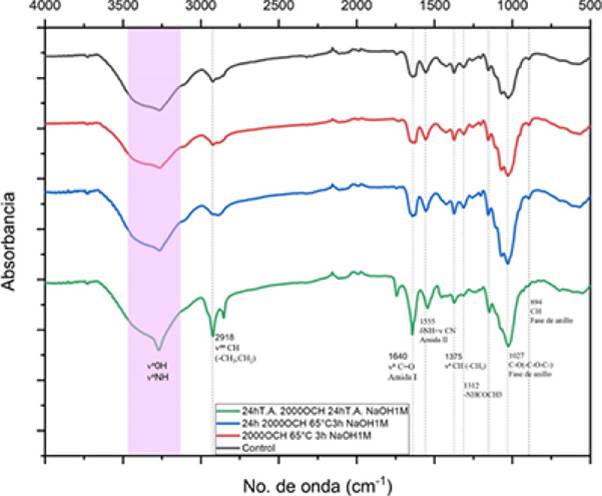 El análisis por espectroscopía infrarroja con transformada de Fourier (FTIR) es muy utilizado para indicar el tipo de quitina obtenida (Figura 5), sabiendo que esta presenta tres formas polimórficas diferentes: α, β y γ (Tsurkan et al., 2021). La Figura 5 muestra espectros de absorción de quitina obtenidos en la región de número de onda entre 4000 y 500 cm-1. Para cada espectro se resaltan las bandas de absorción más intensas características para la quitina: 3269 cm-1 (tensión del grupo N-H), 2918 cm-1 (tensión de enlace C-H; CH3 ), 1640 cm-1 (C=O), 1555 cm-1 (C-N, C-N, N-H amida II), 1375 cm-1 (C-H,CH3 ), 1312 cm-1 (-NHCOCH3 ), 1154 cm-1 (C-O-C), 1027 cm-1 (C-O), 894 cm-1 (C-H anillo), 682 cm-1 (N-H), 573 cm-1 (C-C). En la película sin calentamiento (24 h, T.A., 2000 OCH, 24 h, T.A., NaOH 1M), la región correspondiente al grupo amida presenta una sola banda intensa en 1642 cm-1, característica de la quitina β. En este polimorfo la banda de absorción cercana a 1650 cm-1 es atribuida al enlace de hidrógeno entre el grupo (C=O) y los grupos amida (H-N) (Cárdenas et al., 2004; Jang et al., 2004; Aylanc et al., 2020). En el resto de los tratamientos en la misma región se encuentran dos picos poco definidos y menos intensos a 1626 y 1640 cm-1, similares a los que presenta la quitina γ. La quitina α y la quitina γ muestran bandas similares debido al arreglo de las cadenas poliméricas en antiparalelo, una banda cercana a 1660 cm-1 correspondiente al enlace de hidrógeno entre los grupos carboxilo (C=O) y los grupos amida I y II (H-N) de la misma cadena y en 1620 cm-1 causada por el enlace de hidrógeno entre grupos carbonilo, con los grupos -CH2OH de las cadenas laterales (Cárdenas et al., 2004; Jang et al., 2004). La presencia de una banda pronunciada para todos los tratamientos en 3269 cm-1, correspondiente a los grupos OH y NH y la ausencia del pico en 3479 cm-1, es una característica distinguible en la quitina β (Cárdenas et al., 2004). Por las observaciones anteriores, es probable que se hayan obtenido películas de quitina con contribuciones de β y γ; sin embargo, resulta interesante que las bandas asociadas con quitina de tipo γ, se hayan presentado en las muestras que recibieron tratamiento con calor.