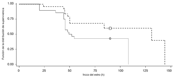 El efecto macho influyó (P <0.05) en el inicio del estro en las ovejas sincronizadas con dos dosis de prostaglandinas (cuadro 1). Usando protocolos de sincronización con PGF2( sin “efecto macho”, se ha reportado que el estro se presentó a las 36 ± 2.3 h (Letelier et al., 2011) y entre las 38.6 ± 0.5 y 51.6 ± 2.4 h (Fierro et al., 2013). Estos resultados difieren con los obtenidos en las ovejas bioestimuladas con “efecto macho” en el presente estudio. El inicio del estro analizado mediante curvas de supervivencia (figura 2), señala que las ovejas sincronizadas con dos dosis de prostaglandinas y bioestimuladas con “efecto macho” iniciaron el estro más pronto y de manera más agrupada, ya que, a las 50 h posteriores de la segunda aplicación de prostaglandinas, alrededor del 90% de las ovejas manifestaron estro, comparadas con aquellas sin “efecto macho”, donde las ovejas obtuvieron menor respuesta. La presencia del carnero influye en el inicio del estro, según el fármaco aplicado en la sincronización del estro, incluso al introducir carneros vasectomizados después de aplicar la segunda dosis de PGF2( para adelantar el inicio del estro (Ungerfeld, 2011).