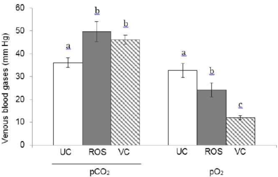 In contrast, the pO2 values of UC were approximately three times higher than those obtained from VC (32.68 ± 3.03 mm Hg 12.01 ± 0.89 mm Hg, P <0.001, respectively). In our study, the values of healthy piglets from CV were lower than those reported for neonates with asphyxia (21.7 ± 10.5 mm Hg) by Orozco-Gregorio et al., (2012), without an asphyctic profile in its entirety (values pH and pCO2 within normal ranges); which confirms that these animals were not asphyxiated neonates; however, its pO2 was the lowest. On the contrary, ROS sampling showed values50% higher than VC for the same variable (pO2: 24.12 ± 3.09 mm Hg VS 12.01 ± 0.89 mm Hg, P <0.05), but lower than UC (32.68 ± 3.03 mm Hg, P <0.05). The oxygen in ROS, in the same way as in VC, exhibited concentrations suggestive of intrapartum asphyxia (<26.4 ± 17.7 mm Hg), which can generate confusion, and therefore lead to an erroneous diagnosis, since our data in set did not match the diagnostic inclusion criteria of a piglet with suffocation. However, it is widely accepted that childbirth increases the risk of compromised oxygenation by the fetus, which can lead to interruptions in gas exchange, where certain degrees of hypoxemia and acidemia are normal; even in healthy fetuses during a eutocic delivery (Yli y Kjellmer, 2016).