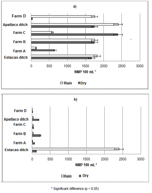 Figure 1, section a, shows that in the case of the farms supplied with water from Las Estacas ditch, the highest concentration of total coliforms is reported in farm C during the dry season, while during the rainy season there is a reduction in their concentration; in contrast, Apatlaco ditch and farm D show an increasing trend.