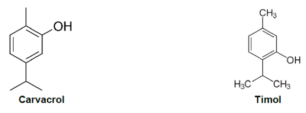 El timol es un isómero de Carvacrol (Figura 2), es una sustancia aromática de coloración cristalina blanca, de baja solubilidad en agua y alta en solventes orgánicos, con pH neutro, pero puede tener características alcalinas en soluciones acuosas debido a la desprotonación del fenol (Chizzola, 2013). Presenta actividad bactericida, fungicida, insecticida, nematicida, varroocida (Gallegos et al., 2022). Se ha reportado su efecto antibacteriano in vitro contra Escherichia coli, Salmonella spp. y S. aureus a una concentración de 0.75 mg/mL (Shapira-Mimran 2007; Gallegos et al., 2019). En concentraciones de 1 % y 2 % en aceite esencial de orégano, tiene mayor actividad antimicrobiana contra bacterias Gram positivas y menor sobre bacterias Gram negativas (Du et al., 2015; Erazo et al., 2017). En estudios in vitro sobre enterobacterias Gram negativas se encontró mayor actividad antibacteriana del timol de Lippia berlandieri a diferencia de otros antimicrobianos (Garcia et al., 2022; Garcia et al., 2022). El mecanismo de acción antibacteriano es similar al de carvacrol, se une a las membranas bacterianas de manera hidrofóbica por puentes de hidrógeno afectando la membrana externa e interna, incrementando la permeabilidad y la pérdida de iones de potasio y ATP intracelular, ocasionando la muerte celular (Di Pasqua et al., 2010).