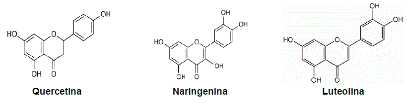 En L. graveolens los flavonoides (Figura 3) con mayor reporte de actividad biológica son naringenina, quercetina y luteolina (Lin et al., 2007). La naringenina es un compuesto bioactivo con actividad hepatoprotectora, antiaterogénica, antiinflamatoria, antimutagénica, anticancerígena y antimicrobiana (Ke et al., 2017). En reacción con yoduros de alquilo forma compuestos de O-alquilo de naringenina con potencial antibacteriano contra Escherichia coli, Staphylococcus aureus y Bacillus subtilis (Kozłowska et al., 2019). Un derivado de O-alquilo naringenina, es la sakuranetina (7-Ometilnaringenina) con importante actividad antimicrobiana frente a bacterias Gram negativas y Gram positivas. La naringenina inhibe el crecimiento de Staphylococcus aureus, afectando la membrana celular y la composición de ácidos grasos. En Escherichia coli actúa a nivel de los genes asociados a la biosíntesis de ácidos grasos de la membrana (Wang et al., 2018).