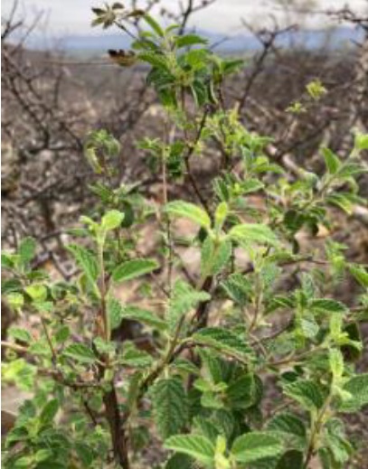L. graveolens es una planta arbustiva perenne, alcanza dos metros de altura, presenta ramas de corteza exfoliante con hojas pecioladas opuestas, ovaladas lanceoladas, haz rugoso escabroso, estrigoso glandular, envés densamente piloso, ápice obtuso y margen diversamente crenado (Ocampo et al., 2009). La floración se presenta en época con mayores precipitaciones (Bueno, 2014), su inflorescencia es indeterminada de tipo espiga subglobosas, corolas blancas, zigomorfas, con flores pequeñas de 4 mm hermafroditas, en cantidades de 2 a 20 flores, presenta frutos pequeños de cápsulas indehiscentes, con semillas sin endospermo (Figura 1) (Ocampo et al., 2009).