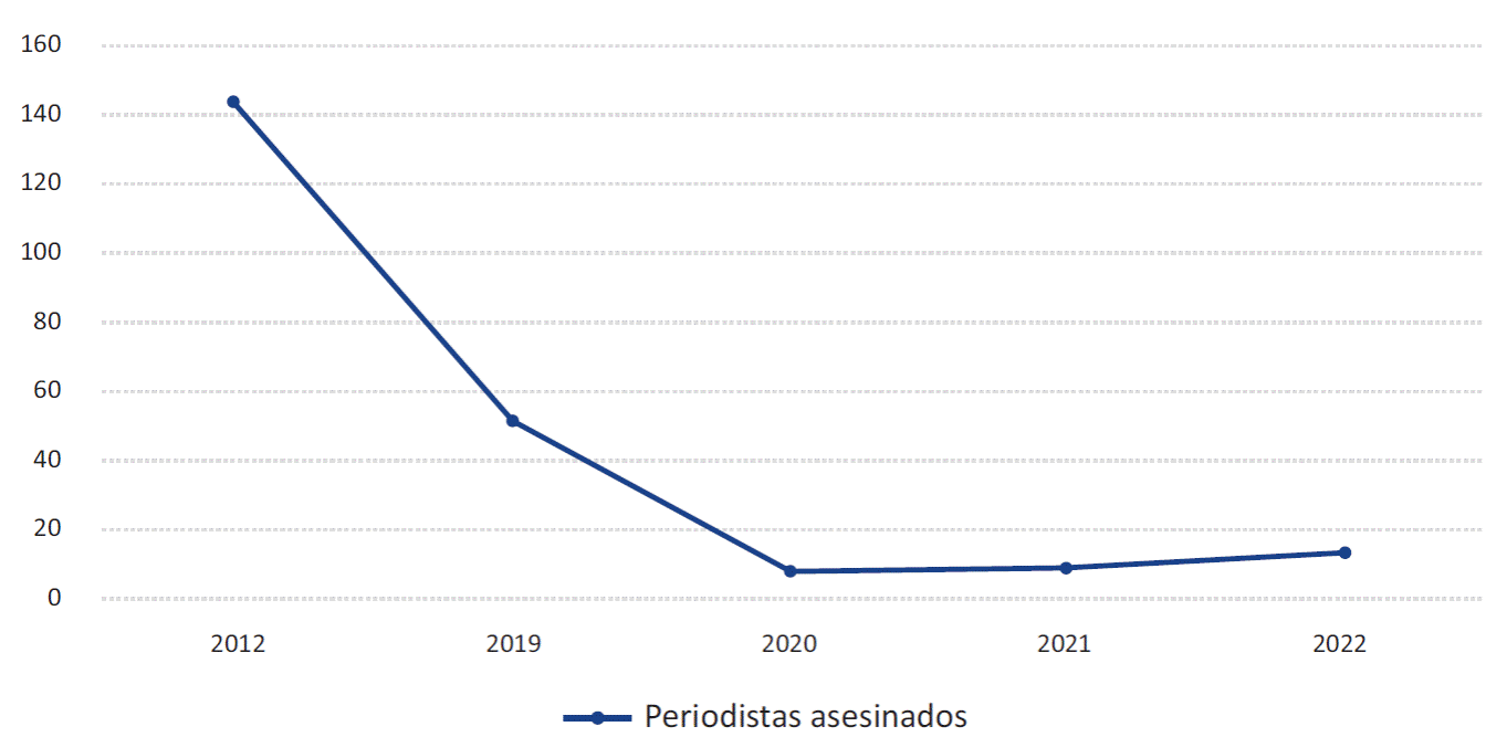 En cuanto a la amenaza a la libertad de prensa, hay que destacar que el punto más alto de asesinatos a periodistas fue 2012, con 143. Ese número “ha disminuido de manera constante” (IEP, 2020a, p. 4). En 2022, México se ubicó como el “segundo país más mortífero para los periodistas, sólo detrás de Ucrania” (IEP, 2023a, p. 3) dado que “corren peligro cuando cubren temas relacionados con la delincuencia organizada” (IEP, 2021a, p. 1).