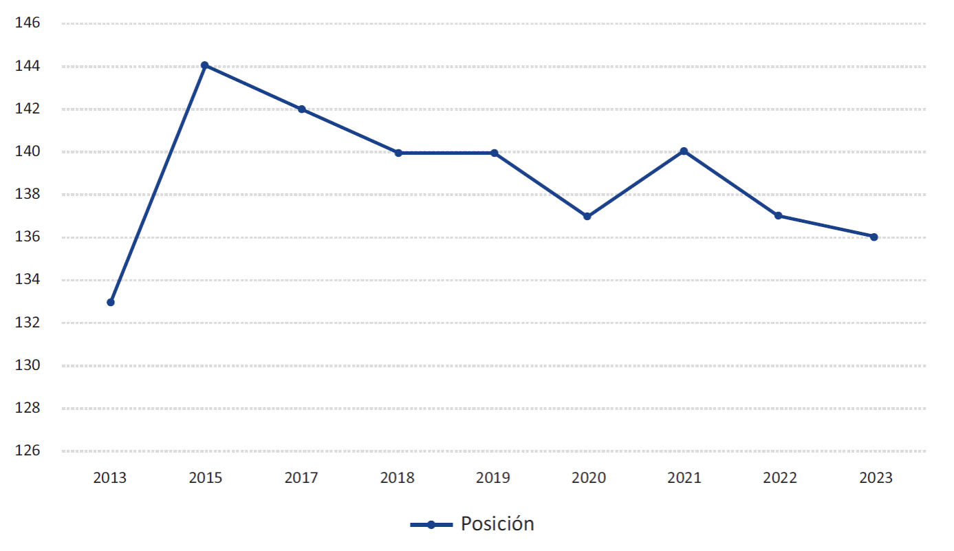 En lo que respecta a la violencia mencionada, según el Índice de Paz Global (Global Peace Index) del Instituto para la Economía y la Paz (IEP), en 2013 México ocupaba el lugar 133 de 162 países evaluados. Llegó a su peor posición en 2015, ubicándose en el 144 de 163 países. Para 2017, el país mostró una mejora, alcanzando el lugar 142 de 163 países, y en la edición más reciente, de 2023, se encuentra en el puesto 136 de 163 (IEP, 2023, 2017, 2015, 2013).12 Esto indica que, a pesar de las variaciones, México se mantiene en una posición relativamente similar. De hecho, el reporte ha señalado consistentemente que México se ha vuelto progresivamente menos pacífico, una tendencia que las cifras publicadas periódicamente por el INEGI corroboran claramente.13