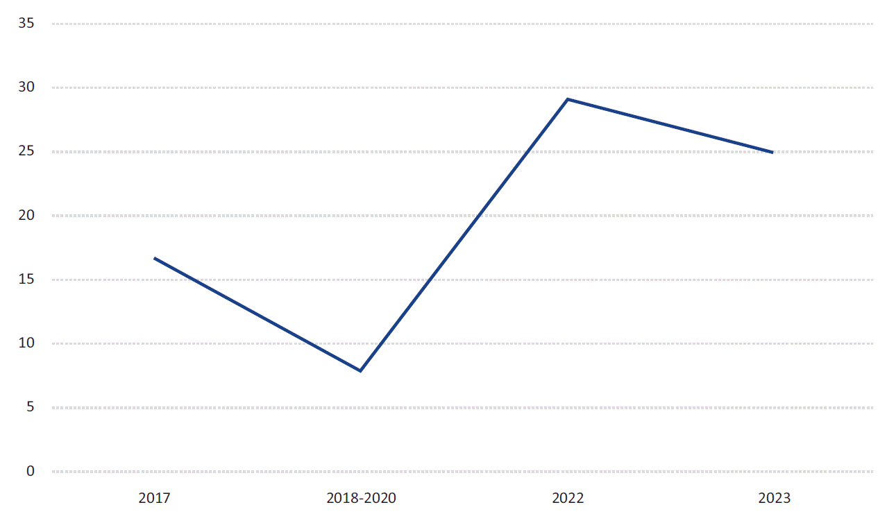 En línea con lo anterior, tenemos las cifras más altas de homicidios durante mucho tiempo. En 1990 la tasa de homicidios fue de 16.6 por cada 100 mil habitantes, en 2007 se registró un mínimo histórico de 8.1, para llegar a un nuevo récord en 2017 de 26 (INEGI, 2019: VII). Este récord quedó superado en 2018-2020 con una tasa de 29 homicidios por cada 100 mil para bajar a 25 en 2022 (INEGI, 2023a, p. 1 y 8) (Gráfica 3).14 Por otra parte, en 2022, 27.4% de los hogares contó con al menos una víctima (INEGI, 2023c, p. 7) frente al 35.6% del 2017 (INEGI, 2018, p. 6) o el 34.2% de 2016 (INEGI, 2017) La cifra negra estimada para 2023 es de 92.4% frente a la 93.6% en 2017 (INEGI, 2023c, 2018), prácticamente sin variación.
