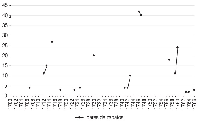En las gráficas 1 y 2 hemos intentado visualizar los pedidos de zapatos y sombreros. Si ponemos estas cantidades en relación con la población de Batuc, se ve que sólo unos cuantos de los habitantes pueden haber recibido zapatos o sombreros. En 1746 y 1747 se ordenó un número mayor de pares, aunque aún así era insuficiente para todos. Es de sospechar que el P. Rapicani los adquirió para la gente que empleaba en la construcción de la iglesia, para los peones que se empezaron a contratar para trabajar la tierra o, tal vez, para los magistrados del pueblo (el gobernador y el fiscal).