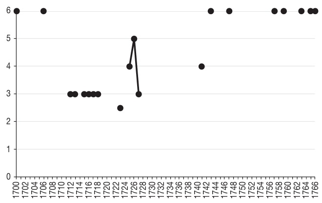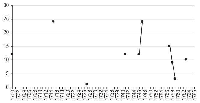 Fuente: Apéndice 1. Nota: en 1730 se solicitaron 2 pares y entre 12 y 24 pares más; para la gráfica he calculado con 20 pares.