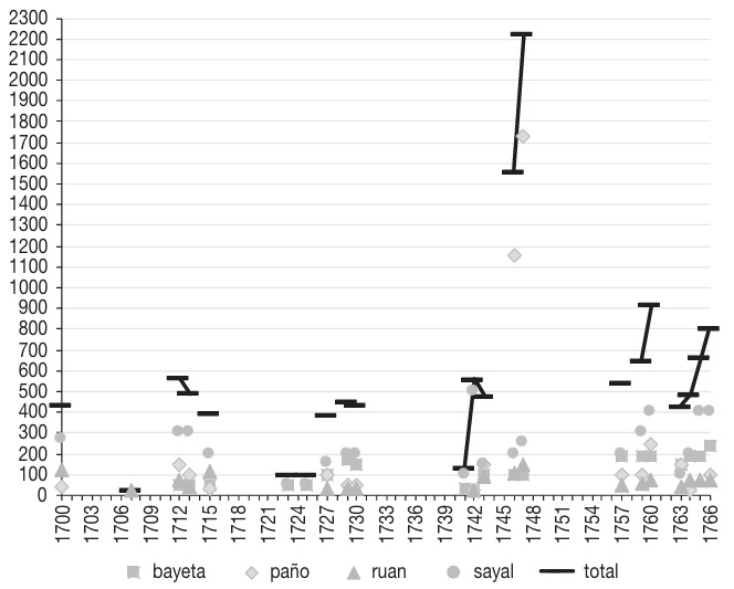 Otras conclusiones las permite una mirada a los textiles más pedidos: bayeta, paños, ruan y sayal, que se usaban, sobre todo, para la vestimenta de los indios. Cuantificarlos enfrenta el problema que se ordenaron tanto en varas como en piezas. No sabemos cuánto medía una pieza. Pero, en la información recuperada para el cuadro 7, del año 1700, se identifica la longitud de algunas “piezas”. Oscila entre 37.5 y 66 varas, con un promedio de 48 varas, valor que hemos usado para la gráfica 3.