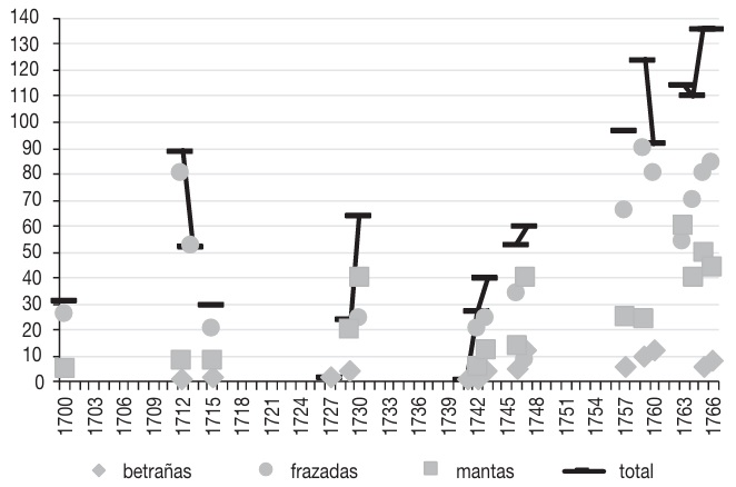 Fuente: Apéndice 1. Nota: en 1700, si deciframos bien la fuente, se pidieron 250 frazadas, pero sólo se enviaron 25 (véase el cuadro 7).