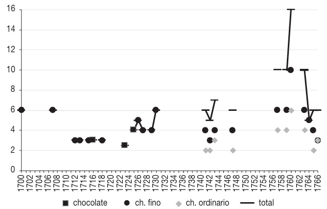 Aunque los textiles, tanto en volumen como en valor, abarcaban la mayor parte de los productos solicitados, la mercancía que casi todos los padres pedían y en la que más se gastó era el chocolate,159 junto con el cual se solían pedir cantidades aproximadamente idénticas de azúcar. Tenemos el problema de que el azúcar a veces se cuantificó en arrobas, a veces en tercios. El peso de un tercio no era fijo, pero en el registro reproducido en el cuadro 7, se equivale con 6 arrobas, y así lo hemos usado (gráficas 5-6).160