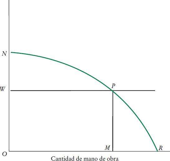3. Si se dispone en forma ilimitada de mano de obra, y, en cambio, escasea el capital, sabemos que, en virtud de la “ley de las proporciones variables”, el capital no debería repartirse en una capa delgada y general sobre el total de las disponibilidades de mano de obra. Sólo debería usarse con capital tal cantidad de mano de obra como fuera necesaria para reducir a cero la productividad marginal de la fuerza de trabajo. Sin embargo, en la realidad no se dispone de mano de obra con un salario igual a cero. El capital sólo se aplicará, en consecuencia, hasta el punto en que la productividad marginal del trabajo iguale el salario corriente. Este hecho se ilustra en la Gráfica 1. El eje horizontal mide la cantidad de mano de obra y el vertical su producto marginal. Se dispone de una cantidad fija de capital. OW es el salario corriente. Si el producto marginal de la mano de obra fuese cero, fuera del sector capitalista, la ocupación debería ser igual a OR. Pero en el sector capitalista sólo será rentable dar ocupación a ON. WNP es la plusvalía capitalista. OW PM va en concepto de salarios a los obreros en el sector capitalista, mientras que los obreros situados fuera de ese sector (es decir, más allá de M) ganarán lo que puedan en el sector de subsistencia de la economía.