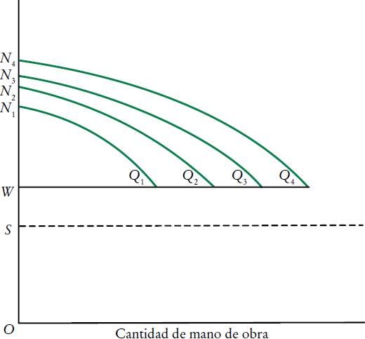 Según la Gráfica 3, OS expresa, como antes, los rendimientos promedio de subsistencia, y OW, el salario capitalista. Como parte de esa plusvalía se reinvierte, aumenta la cantidad de capital fijo. A consecuencia de ello, el patrón de productividad marginal del trabajo se eleva, con carácter general, hasta el nivel de N2Q2. Las dos cosas -la plusvalía y la ocupación capitalista- son ahora más amplias. Una ulterior reinversión eleva el patrón de la productividad marginal de la mano de obra a N3Q3. El proceso continúa mientras existe mano de obra excedente.