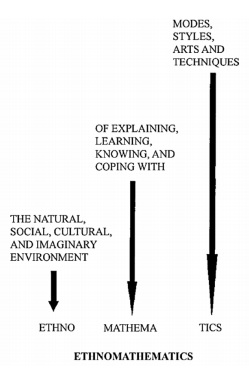 Why was the word Ethnomathematics a choice? I am concerned with the ways, modes, styles, arts and techniques, generated and organized by different cultural groups for learning, explaining, understanding, doing and coping with their natural, social, cultural, imaginary environment. But this is too long to repeat every time. It is convenient to find a single word! The Greek roots techne, or in a simplified form, tics stands for the ways, modes, styles, arts and techniques. The root mathema means learning, explaining, understanding, doing and coping. And the root ethno means the natural, social, cultural, imaginary environment of a group of individuals. So, we are concerned with the techné (tics) of mathema in distinct ethnos. Thus, the word ethno + mathema + tics was a natural choice after this etymological exercise. (p. 5-6).