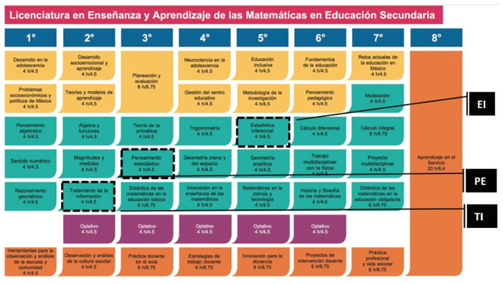 El plan de estudios de la LEAMES contempla tres cursos (de carácter obliga-torio) vinculados con la estadística y la probabilidad: Tratamiento de la Información (TI), Pensamiento Estocástico (PE) y Estadística Inferencial (EI); en segundo, tercero y quinto semestre, respectivamente.