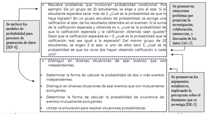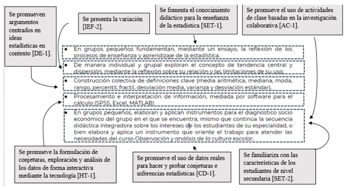En el programa de estudio de EI se establecen estrategias para evaluar el conocimiento estadístico (SET-4), ya que, a través del diseño de secuencias didácticas para la enseñanza de la estadística, se propone evaluar el conocimiento estadístico del estudiante de secundaria, así como el análisis de sus resultados de evaluación para conocer sus características de aprendizaje (SET-2).