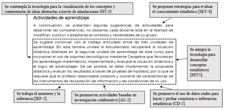 El curso TI se caracteriza por fomentar la reflexión en el futuro profesor sobre los procesos de enseñanza-aprendizaje de la estadística y proponer el RE como uno de los elementos esenciales para la autoformación futura de todos los individuos, considerando cualidades como el saber reconocer la necesidad de los datos, la transnumeración, la percepción de la variación, el razonamiento con modelos estadísticos y la integración de la estadística en contexto (SEP, 2018). En la figura 3 pueden observarse actividades que se proponen en el programa del curso TI, donde se señala la presencia de algunos de los elementos que conforman el RE.