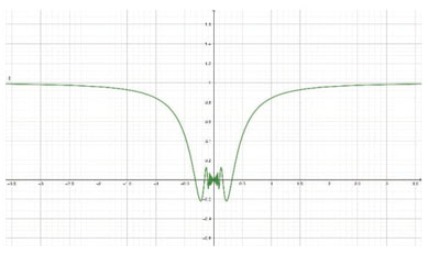 Un autre type de contre-exemple concerne les fonctions continues en un point a, mais dont la limite lorsque h tend vers 0 de leur taux de variation entre a et a+h n’existe pas. Par exemple, la fonction fx=xsin1xsi x00si x=0 est continue en 0, mais n’est pas dérivable en 0. En effet, limh0f0+h-f(0)h=limh0hsin(1h)h=limh0sin(1h) n’existe pas du fait des oscillations de la fonction f autour de 0. Sa courbe repré-sentative ne possède donc pas de tangente fixe en 0. Voici la représentation graphique de cette fonction: