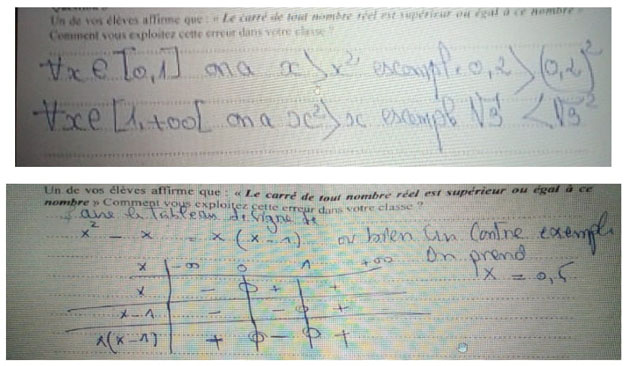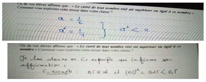 Nous considérons que présenter des contre-exemples, expliquer pourquoi ils contredisent la proposition et montrer comment construire les théorèmes (1) et (2) à partir de l’affirmation fausse de l’élève inscrit le travail de l’enseignant dans une approche de réfutation par contre-exemple général. Se limiter à une réfutation par contre-exemple spécifique (indiquer un ou plusieurs contre-exemples dans l’intervalle ]0,1[ sans explication) ou semi-général (indiquer des contre-exemples dans ]0,1[ avec explications partielles) appauvrit la situation et ne permet pas à l’élève de réorganiser et d’enrichir ses connaissances mathématiques.
