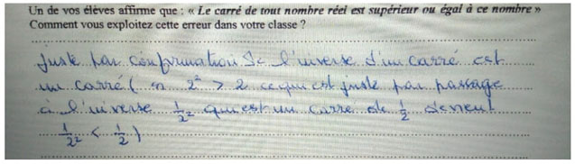 Dans cette question, la proposition mathématique est exprimée en langue naturelle, niveau collège, où l’écriture symbolique algébrique est encore naissante. Nous avons formulé cette proposition en français pour des enseignants maîtrisant cette langue.8 Elle peut être paraphrasée symboliquement ainsi : xIR,x2x. Cette proposition est incorrecte car, par exemple, le nombre réel 0,5 constitue un contre-exemple. La fonction propositionnelle x2x devient vraie si l’on restreint le domaine à IN, les entiers naturels, ce qui explique l’origine de l’erreur de l’élève, pour qui les entiers naturels sont la référence (Hersant, 2013).