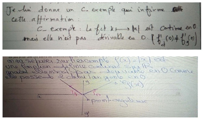 Les analyses des réponses des enseignants ont révélé, également, que dix-huit des vingt-neuf enseignants ont proposé une unique fonction continue en 0 sans être dérivable en 0. Bien que cette fonction représente un contre-exemple à l’affirmation de l’élève, les enseignants n’ont pas enrichi leur réponse par des explications explicites montrant pourquoi la fonction choisie est continue en 0, non dérivable en ce point, et pourquoi elle représente un contre-exemple.