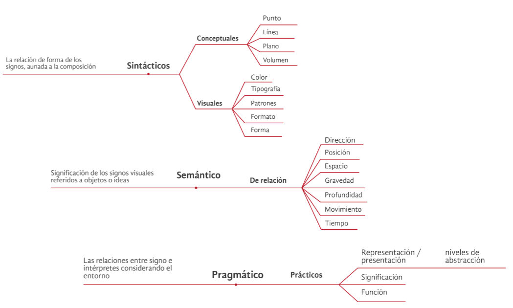 Este diseño se basa en tres dimensiones: sintáctica (formas), semántica (significados) y pragmática (entorno), y contempla el proceso de producción. En la figura 1 podemos observar los elementos, principios y fundamentos que conforman las tres dimensiones y que son la base para la construcción de productos gráficos.