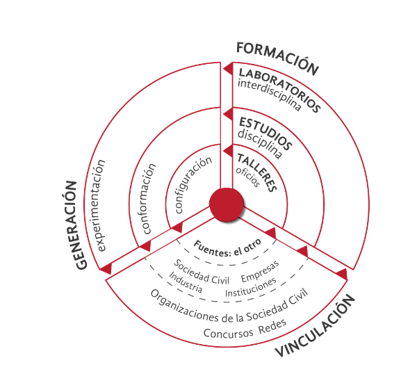 En primer lugar, se enfoca en el oficio del diseño, donde se enseñan los diferentes saberes del diseñador durante los primeros tres semestres; este espacio se denomina Talleres, donde los estudiantes se enfocan en el aprendizaje práctico, complementado con cursos y conferencias magistrales. Se trata de un ejercicio de observación, experimentación, procesos y construcción de propuestas.