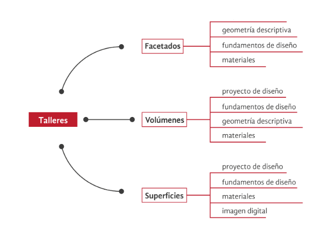 Este taller está conformado por cuatro académicos que, a partir de los diversos saberes que imparten, se centran en la realización de un proyecto único durante un periodo de cinco semanas, a través del cual van explorando los sentidos. Cada taller da énfasis en un sentido, además del de la vista. El primer semestre, de acuerdo con el plan curricular, consta de tres talleres: Facetados, Volúmenes y Superficies, tal como se muestra en la figura 5.