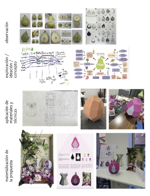 En la figura 7 se presenta el proceso del taller de Facetados, que inicia con la exploración de una fruta hasta la realización de un concepto. Esto incluye el objeto en volumen, geometría descriptiva y caja sensorial. De acuerdo con el alumno, “El proceso creativo realizado fue bastante complicado, pero muy interesante. Este trabajo me concedió la oportunidad de pensar lo cotidiano de una manera completamente diferente para volverlo algo extraordinario. Encontrar la inspiración para un producto o servicio en una fruta me parece una misión bastante compleja de la que sólo se puede encargar un diseñador y, a la vez, creo que es bastante importante este trabajo en la industria, ya que el diseño es lo que le dará la identidad a un producto y lo hará diferente al resto. Personalmente, en este primer módulo me pareció bastante grato todo el trabajo realizado, considero que obtuve nuevas habilidades y pude entender un poco más lo que es el diseño y su importancia en la cotidianidad.” (Benítez, 2023, p. 1)